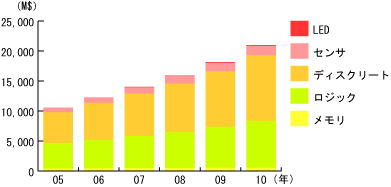 30年後の今日、自動車用半導体は約1.1兆円の規模に成長、半導体市場全体の約7% に成長。2006年は122億ドル規模